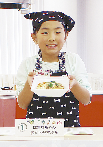 当日は区内在住で最年少の荒井若葉さん(朝比奈小2年)ら6人の小学生が出場。ホテルモントレ横浜総料理長の吉田敏彦さんらプロの審査員が見守る中、自身が考案したレシピを料理した。若葉さんが作ったのは、「はまなちゃんおかわりすぶた」。「若葉にとってはまだ野菜の切り方や厚さが難しかったよう」と話すのは母・真妃さん。切り方をひとつひとつ絵に描いて、教えたという。その甲斐あってか、当日は滞りなく調理し、「笑顔がいっぱい賞」を受賞した。