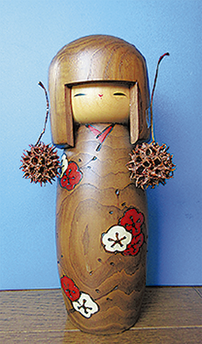果実の柄は樹木側に曲がって下垂しているので、風によく揺れ、その形から子供のイヤリング遊びに最適です。左の写真はフウの果実を、こけしの耳へイヤリング状につけて撮ってみました。