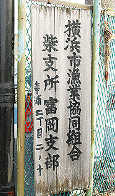 区内幸浦の富岡川の脇にある小さな船着場。入口には「横浜市漁業協同組合 柴支所富岡支部」と書かれた木の看板が掲げられている。富岡の漁師たちは昭和50年ごろにここに移った。