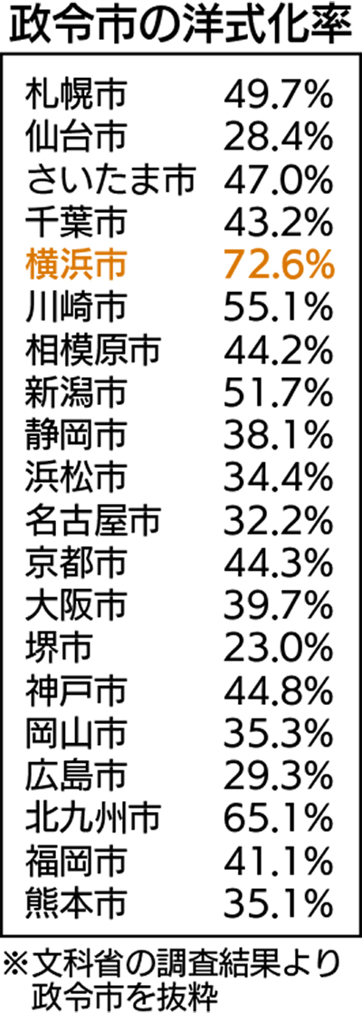 横浜市の小中学校の洋式化率は72・6%で全国平均を29・3ポイント上回った。全国に20ある政令市と比較すると、2位の北九州市よりも7・5ポイント上回り、政令市の中で最も低い23・0%の堺市とは3倍以上の差が開いた。
