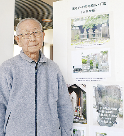 今回の写真展は、磯子在住の吉富和彦さん(90)が撮った、磯子区内の石仏・石塔の写真が展示されている。吉富さんは、2年間で約140カ所を撮影。今回51枚にまとめた。主に「磯子史話」とインターネットを情報源に、庚申塔、地蔵尊、馬頭観音などを紹介している。