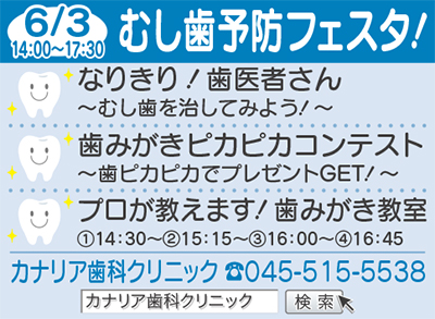 「むし歯の日(6月4日)」にちなみ6月3日(土)、カナリア歯科クリニック(金沢区釜利谷南)で「むし歯予防フェスタ」が開かれる。午後2時から5時30分。参加無料。「なりきり!歯医者さん」や「はみがきコンテスト」などの企画を用意。子どもはもちろん大人にもタメになる内容だ。予防歯科の重要性を訴える同クリニックの川原院長は「むし歯について学ぶきっかけになれば。痛くなる前に歯医者さんを活用していただき、苦手な子供を減らしたい」と話す。