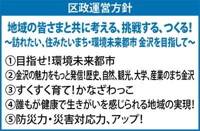基本目標は昨年度と同様に「地域の皆さまと共に考える、挑戦する、つくる!〜訪れたい、住みたいまち・環境未来都市 金沢を目指して〜」とした。目標達成に向けた施策では「持続可能なまちづくり」「産業・観光の魅力発信」「子育て」「健康・福祉」「防災」の5つを柱に。来年5月15日に迎える区制70周年に向けては、昨年立ち上げた「区制70周年を区民と協働で彩る実行委員会」を中心に記念事業を推進していく。