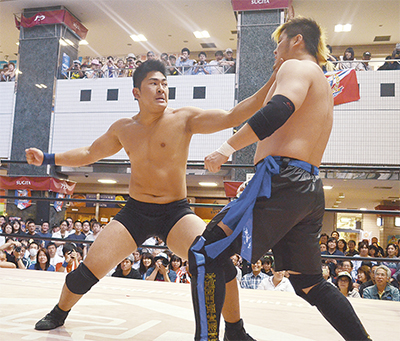 大日本プロレス(都筑区)と横浜市商店街総連合会がタッグを組む「商店街プロレス」が6月3日、磯子区のプララ杉田で開催された。