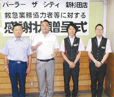 スロットに興じている時に意識がなくなった男性の人命救助をしたとして、パチンコ店「パーラーザシティ新杉田店」の店員に7月14日、磯子消防署から感謝状が贈られた。