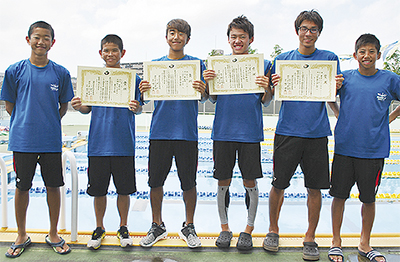 水泳4×100mメドレーリレーで、全国標準記録より2秒35上回る4分14秒48で全中への出場権を手にした。「全国大会で日に焼けた子たちは珍しい」と話すのは横溝真由美顧問。スイミングクラブに所属し室内で練習する選手が多い中、金中選手は部活動が中心。夏は学校の屋外プール、冬は陸トレと近隣のスポーツクラブや大学の室内プールを借り練習を積む。「今年はエースのいないチーム。お互いが支え合って頑張りたい」と末松選手は意気込む。