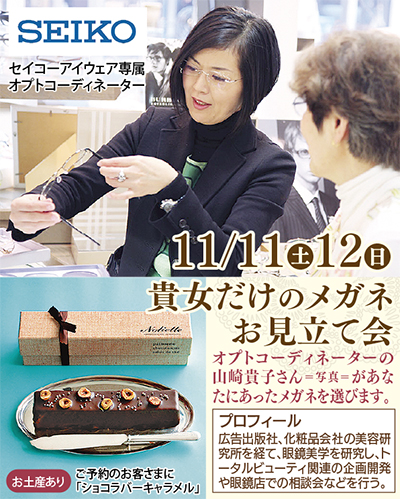 「私に似合うメガネを選んでほしい」という人に、めがねの荒木 追浜店では11月11日(土)・12日(日)、「貴女だけのメガネお見立て会」を開催する。両日とも、オプトコーディネーターの山崎貴子さんが来店。個別の相談を受け付ける(30分程度、無料・要予約)。パーソナルカラーの診断などを通して「美を引き立てるメガネ」を選んでもらえる。