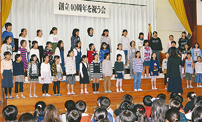 学校や故郷への愛情を育んでもらおうと児童が主体となって節目を祝った。当日は教職員のほか、周辺小中学校の関係者、近隣自治会の会長らが出席。オープニングで太鼓クラブの児童が力強い演奏を、合唱クラブが澄んだ歌声を披露し、華々しく40回目の”誕生日”を祝った。