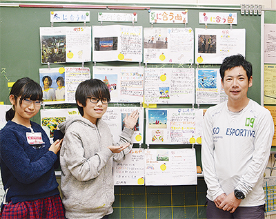 6年2組の児童が総合学習で取り組んだもの。今年で創立55周年の学校と、卒業生で「ゆず」の北川悠仁さん、岩沢厚治さんがデビュー20周年を迎えた「特別な年」を一緒に祝い、郷土愛を育む狙いだ。
