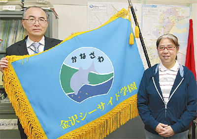 • 実行委員会から贈られた校旗を持つ桐山校長(左)と上村実行委員長
