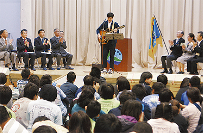 児童生徒、保護者や教員、来賓など300人以上が参加。創立10周年記念事業実行委員会から同校の愛称である「金沢シーサイド学園」の文字が入る校旗が記念品として贈呈されたほか、ギターの弾き語り、校歌合唱などの音楽で学校の10周年を祝福した。桐山直人校長はあいさつで「新たな歴史を共に作っていきましょう」と呼びかけた。