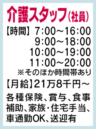 温泉がある施設で利用者の入浴や食事、誘導などの介助のほか、レクリエーションなどを行っている。月10日の公休、有給も取れるのでプライベートも充実。残業はほとんどなく、社会保険や賞与、住宅・家族手当などの福利厚生も手厚い。