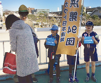 磯子区を中心に活動するボーイスカウト横浜第94団が12月17日、磯子、新杉田、屏風浦の各駅前でユニセフ募金活動を行った。
