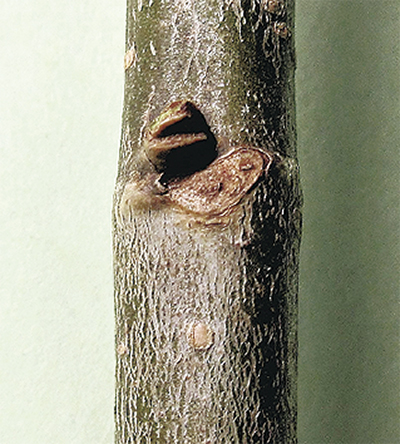ハリエンジュ、オニグルミ、オオバヤシャブシ等の落葉樹は、秋に葉を落として休眠状態に入ります。葉が落ちた痕が、樹木により動物の顔や形など様々な模様をしています。こうした葉の痕を「葉痕」または「葉柄痕」といいます。葉柄の内部には水分や養分が流れる通路があり、樹木によってその位置が違うことや、葉柄の形が違うため、切口の模様が変わってきます。