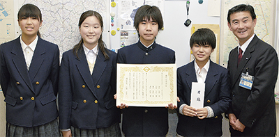 磯子区の市立岡村中学校(斎藤博栄校長)パソコン部の生徒4人に4月16日、「磯子区栄誉賞」が贈られた。生徒は区制90周年を迎えた区の歴史や特徴、地域を支える施設をまとめたWebサイトを制作。2017年度の「全国中学高校Webコンテスト」で銀賞を獲得したことが評価された。