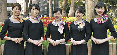 選ばれたのは写真右側より工藤杏奈さん(19)、鈴木佐知さん(38)、齊藤真梨乃さん(25)、今泉マユ子さん(48)、高野りえさん(59)。スカーフ大使は横浜繊維振興会が毎年公募。4月から1年間、各種イベントで横浜スカーフをPRする。