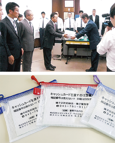 増え続ける振り込め詐欺の新たな手口「キャッシュカード手渡し型」対策として、警察官友の会(及川寛会長)と協賛企業らが啓発メッセージ入りの通帳ケースを作製した。5月1日には、磯子警察署で寄贈式が行われ、及川会長から小高藤安磯子警察署長に手渡された。