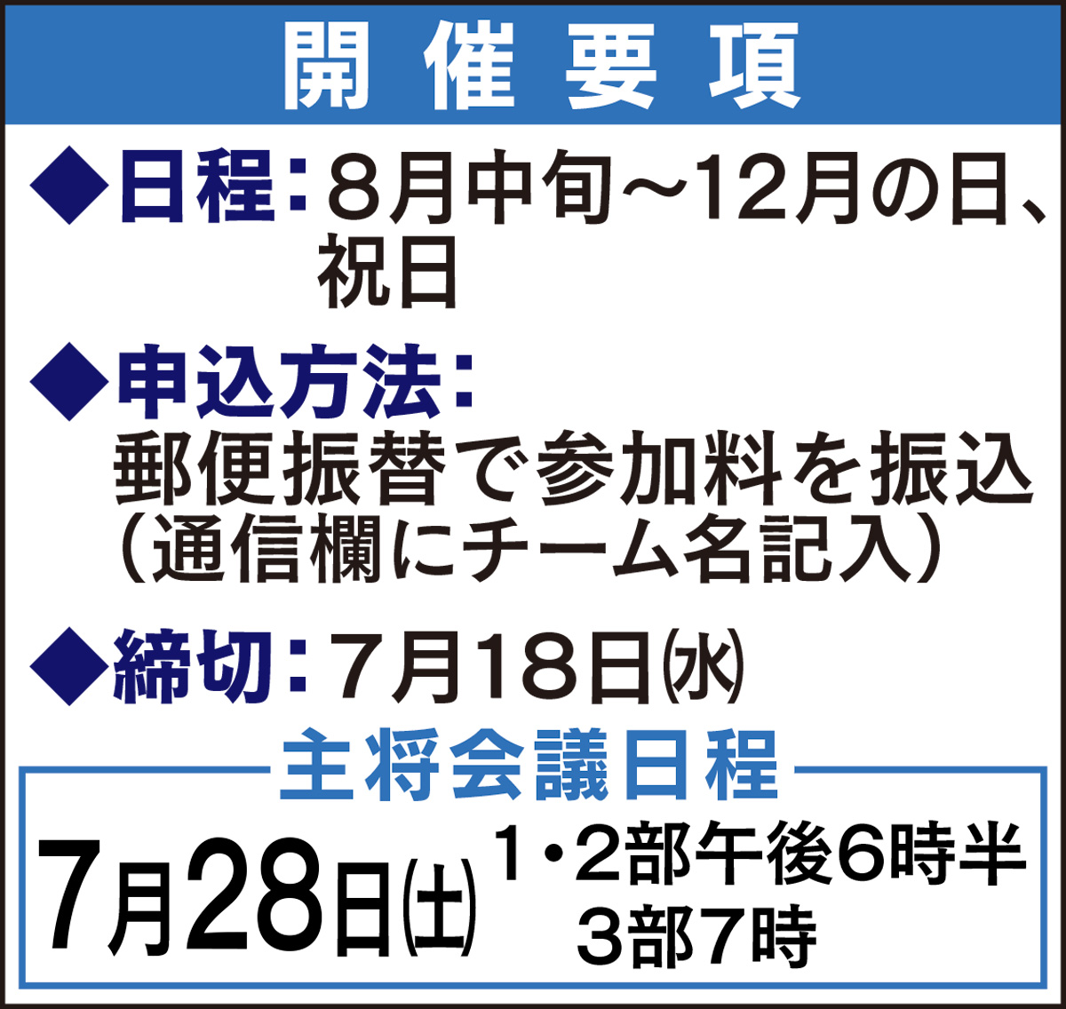参加料は2万円(振込手数料負担)。申込み締切は7月18日(水)。参加チームは7月28日(土)の主将会議に出席。詳細は磯子区野球協会ホームページ(【URL】http://isogo-baseball-association.com/index.html)で確認を。