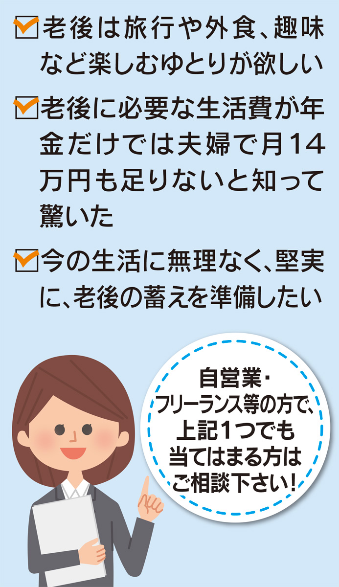 そこで自営業・フリーランスの人に知って欲しいのが、国民年金に上乗せできる「国民年金基金」。最大のメリットは「掛金の全てが社会保険料控除の対象」になること。控除額は最大なんと年間81万6千円で夫婦各々が適用されるほか、将来受け取る年金も公的年金等控除の対象に。節税しながら老後に備えることができるのは、公的な年金制度ならでは。加入時に受給開始年齢や年金の受給額がわかり、一生涯年金を受け取ることができる終身年金のため、人生設計が立てやすいと好評だ。本人はもちろん「子どもの掛金をサポートしたい」という両親等からの相談も増えているという。