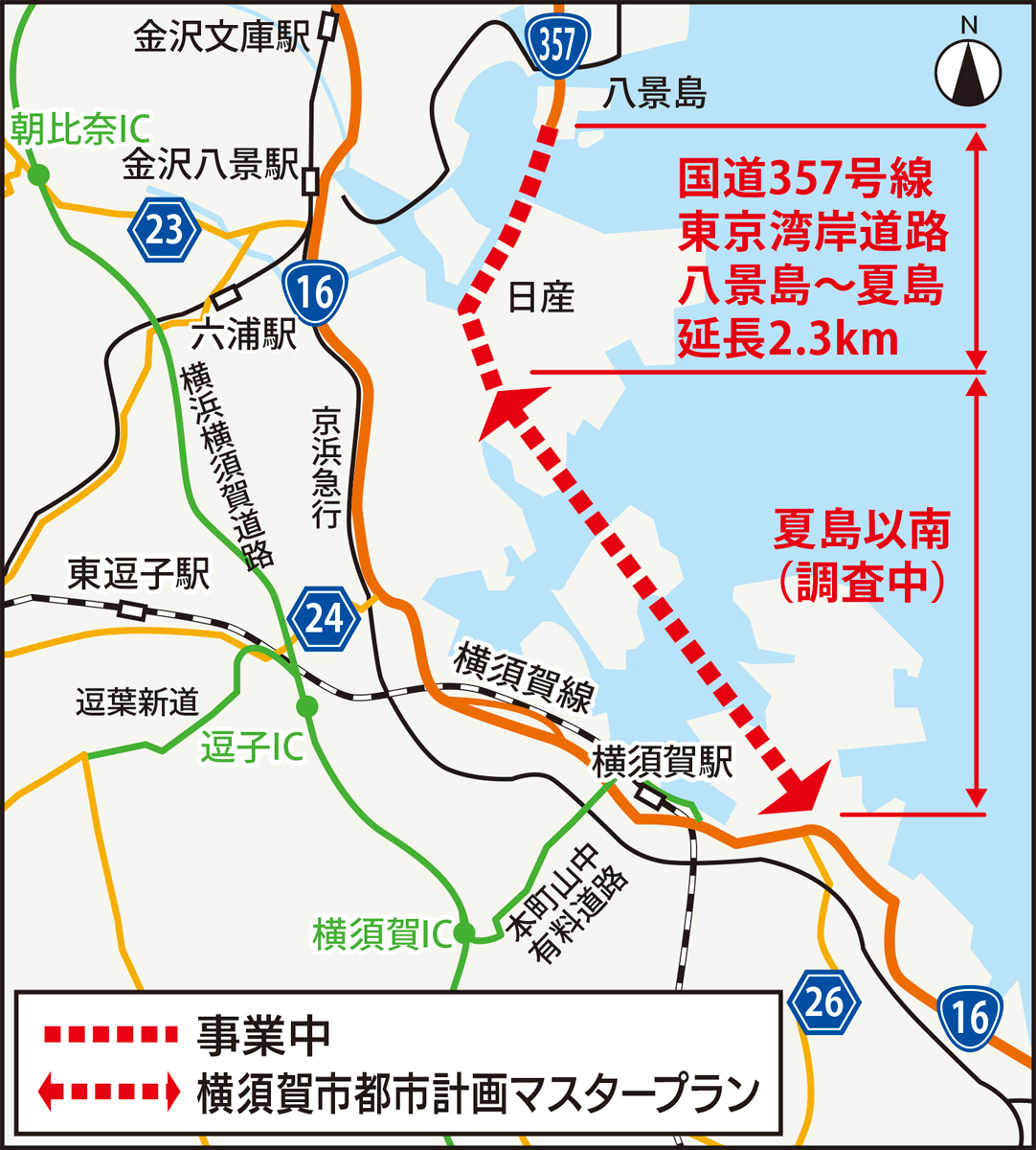 同区間では、南北を結ぶ国道16号が唯一の幹線道路であるため、慢性的な渋滞が発生している。同事務所は、357号線八景島―夏島間の整備で、より人の交流が活発となり、物流の効率化や観光産業の振興が図られ、地域経済の活性化につながることが期待されるとしている。