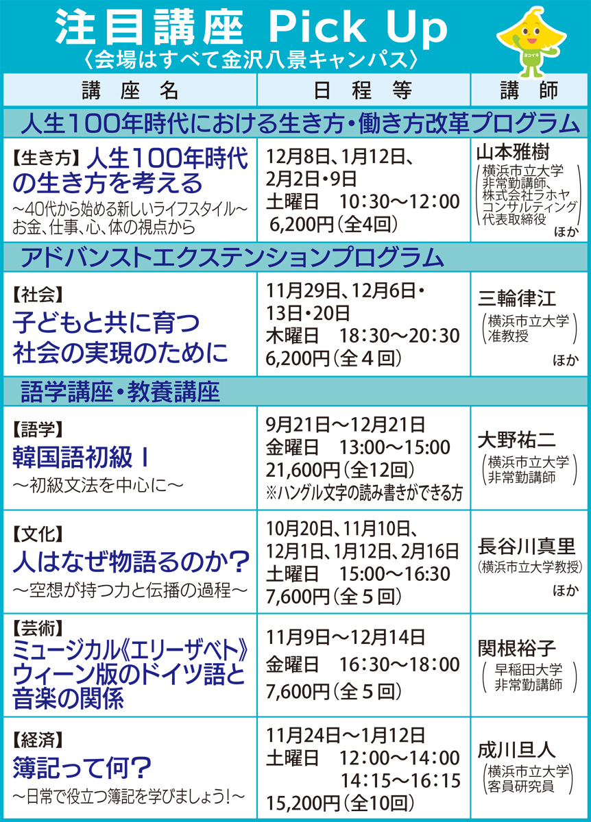 横浜市立大学は大学の持つ知的資源を地域に還元するため、市民向けの生涯学習講座「エクステンション講座」を開講しており、現在、2018年度後期の受講生を募集している。