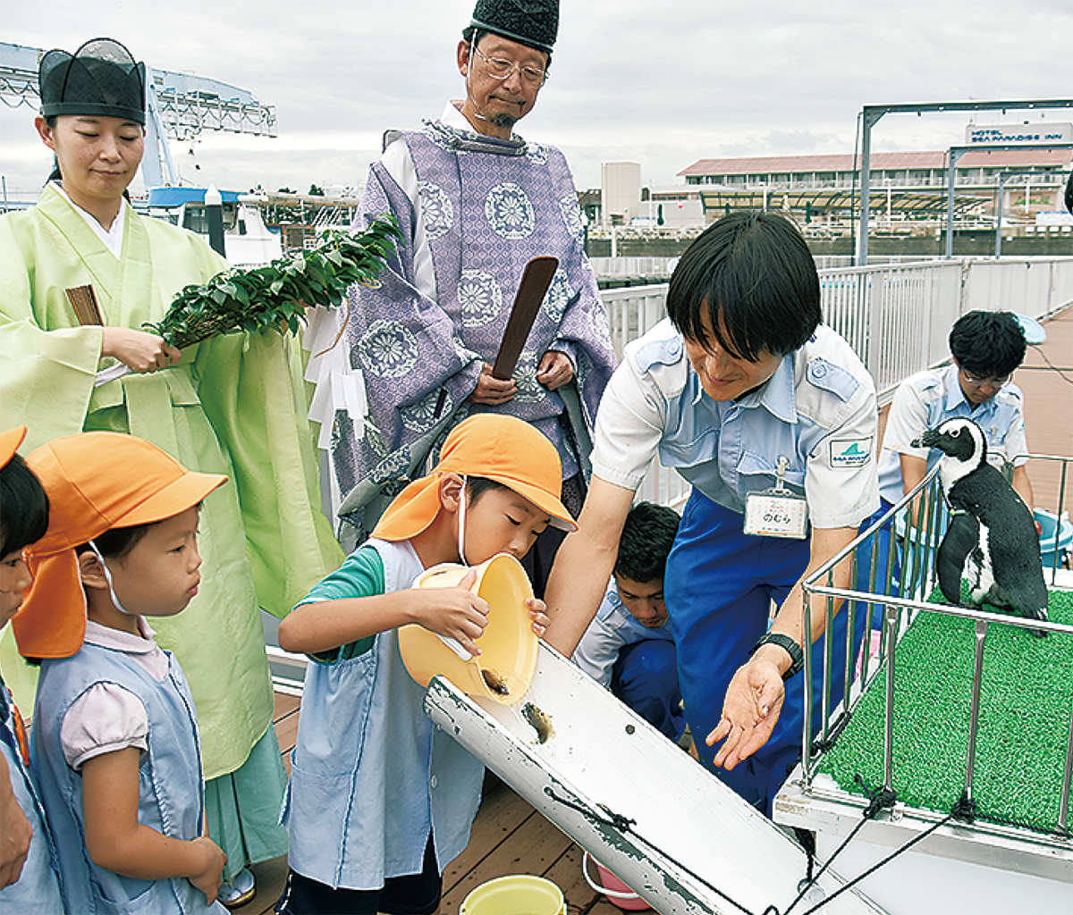 慰霊祭後には園児と保護者がイルカやアシカのショーを通して命の大切さを学び、瀬戸神社の佐野和史宮司やペンギンが見守る中、動物への感謝を込めてクロダイの稚魚200匹を海へ放流した。