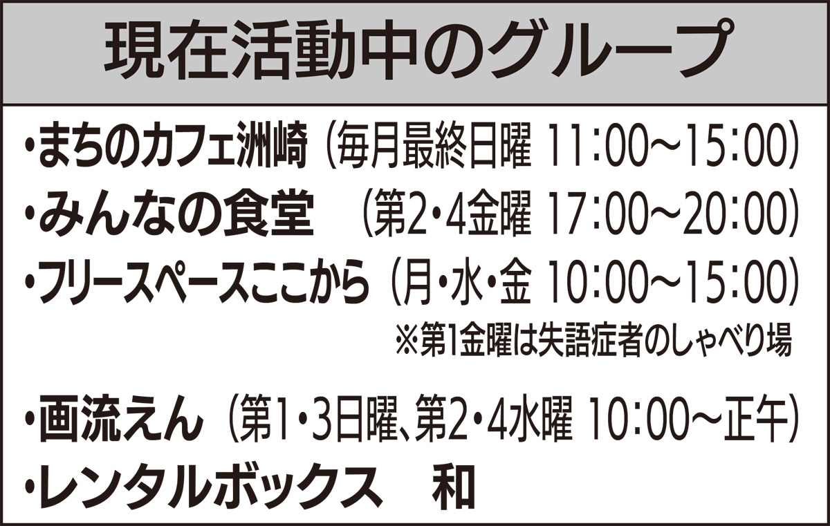 「みんなの居場所 結」の入口の横にある看板には、活動中のグループ名と活動日が並ぶ。現在、活動中のグループは「まちのカフェ洲崎」「みんなの食堂」「フリースペース ここから」「画流えん」「レンタルボックス和」。9月7日からは、フリースペースの時間を使った「失語症者のしゃべり場」も始まった。