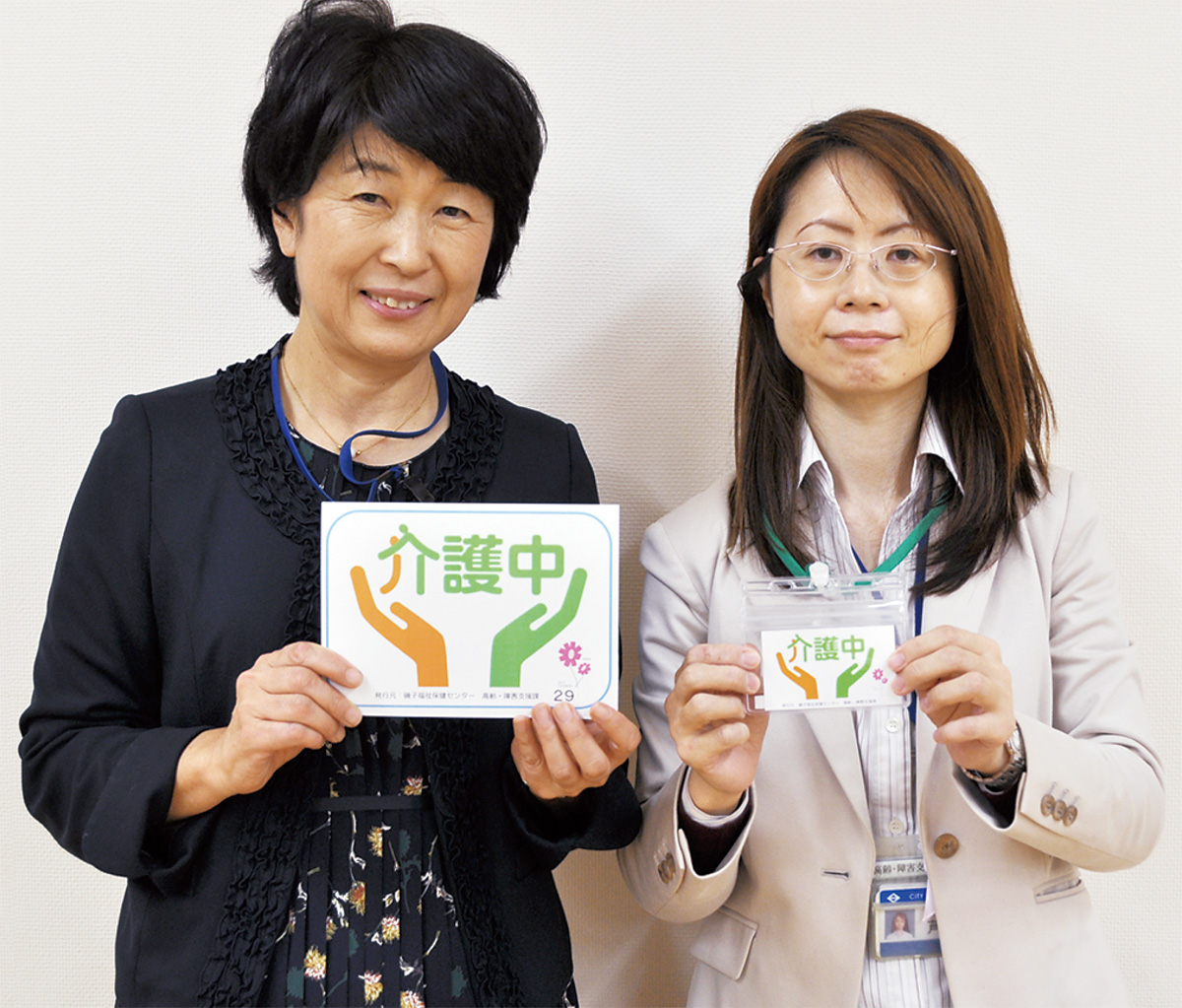 マークはネームプレートに入れ、首から下げて使う「名札タイプ」と裏面が磁石で、トイレの入り口などに貼り付けられるA5版の「マグネットタイプ」の2つ。磯子区役所と区内ケアプラザで交付しており、原則磯子区内で高齢者や障害者などの介護をしている家族らが対象。費用は無料だ。