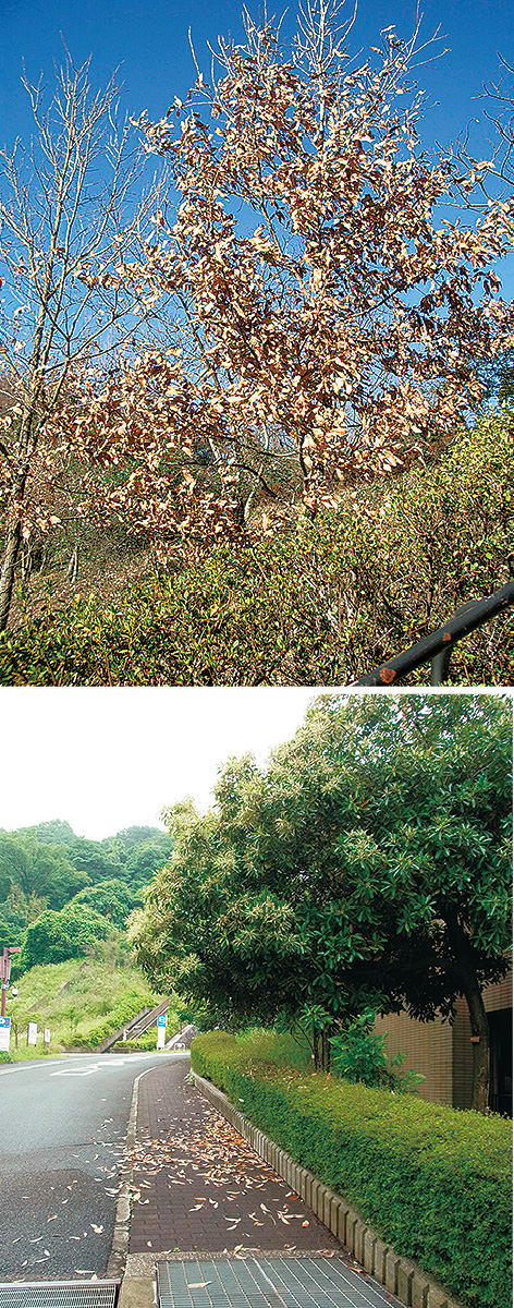 ※常緑樹も落葉しますが一斉ではなく、主に春から秋にかけて順次、葉を落とします(写真下)。