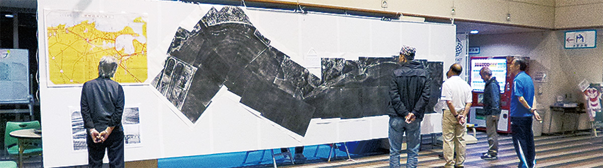 埋め立て前の金沢区の海岸線を撮影した昭和40年代の精密航空写真が4月27日(土)まで金沢スポーツセンターロビーで展示されている。紙幅7mにわたり、旧海軍航空隊飛行艇格納庫・富岡漁港・長浜検疫所、沖合の海苔ひびなどが写っている。