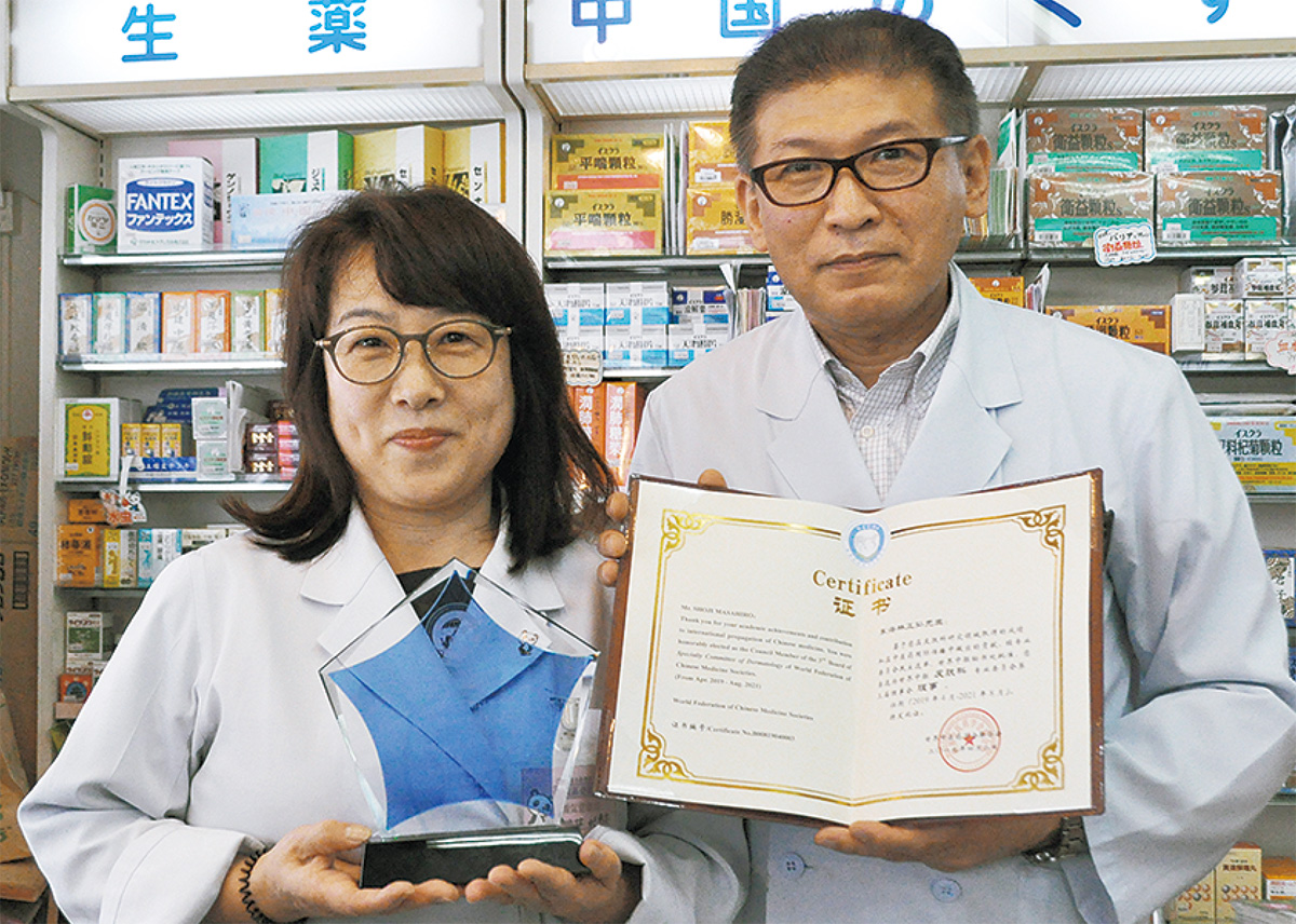 金沢文庫駅東口にある「開気堂薬局」は中医学の普及に貢献したとして、このほど世界中医薬学会連合会から表彰を受けた。また同薬局の薬剤師・東海林正弘さんは、同連合会の皮膚病専門委員会の理事にも任命された。