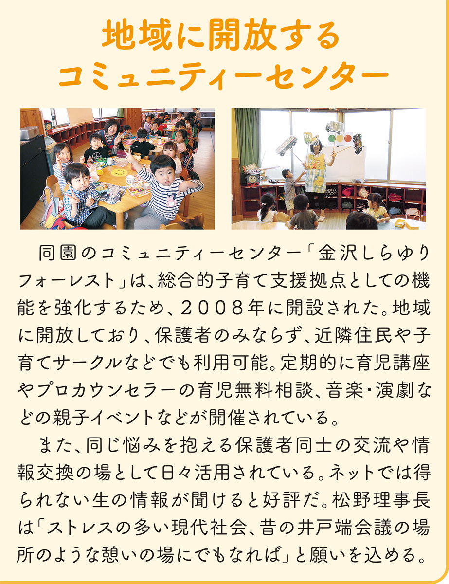 「働きながら幼稚園に入れたい」「保育士の質が心配…」「預かり保育は必要」――時代の変化と共に、保護者のニーズは多様化している。「これからは総合的な視点が求められる」と話すのは金沢白百合幼稚園の松野茂理事長だ。増加する1、2歳児の保育ニーズ、要求される質の高い幼児教育や多様な保育機能に対応しようと進化を続けてきた。