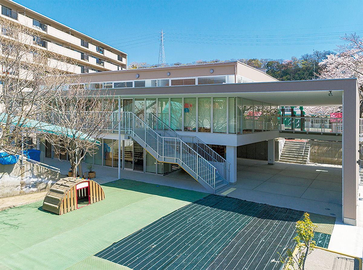 横浜市型の預かり保育を行う幼稚園は、既存施設の共有や空き部屋利用で行う園がほとんど。そんな中、同園はさらに豊かな環境を目指し、今春、保育専用棟を新設した。従来の充実した幼児教育に加え、きめ細やかな保育ができるよう、随所に工夫がなされている。