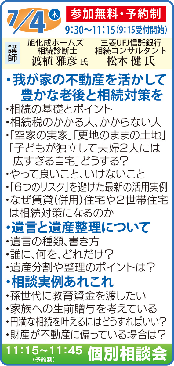 当日は相続の基礎やポイント・最新の税制を押えながら、老後を豊かに暮らせるよう、また相続対策に有効な実家や自宅、空いている土地などの最新活用方法を、実例を交えて説明。さらに三菱UFJ信託銀行の相続コンサルタントが遺言や遺産整理のポイント、注意したい点なども分かりやすく解説する。役立つ情報満載なので、ぜひ参加を。