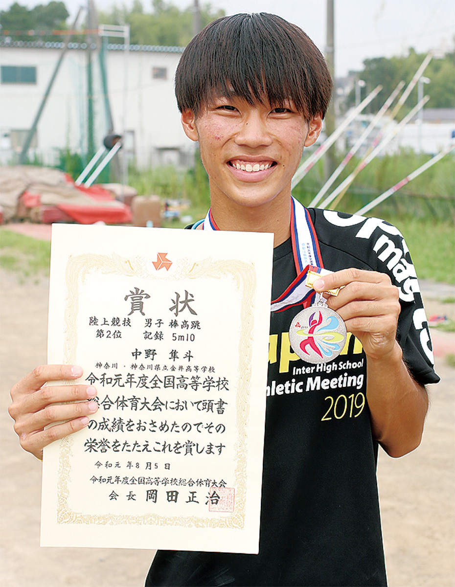 磯子区杉田在住で県立金井高校(栄区)3年の中野隼斗さん=写真=が8月5日、沖縄市で開かれた全国高校総体(インターハイ)の男子棒高跳びで、5m10の記録で2位タイに輝いた。高校で初のメダルに「これまで頑張ってきたご褒美なのかな」と笑顔を見せた。
