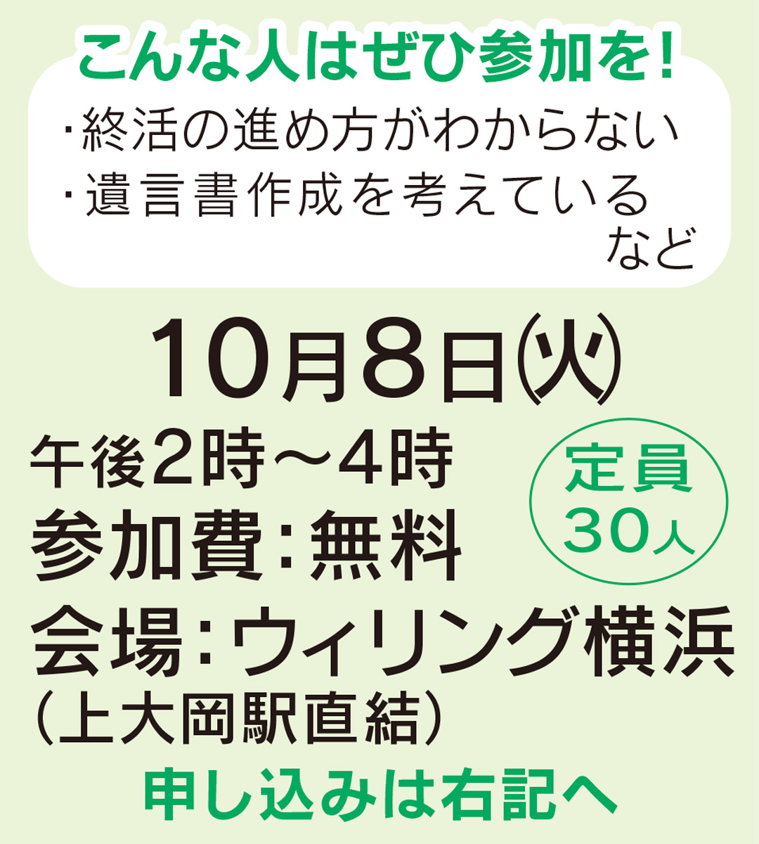 浅木克眞税理士事務所(磯子区東町)主催の「遺言書作成に向けての相続・贈与の基礎知識セミナー」が10月8日(火)、ウィリング横浜11階多目的室(上大岡駅直結)で行われる。参加費無料。