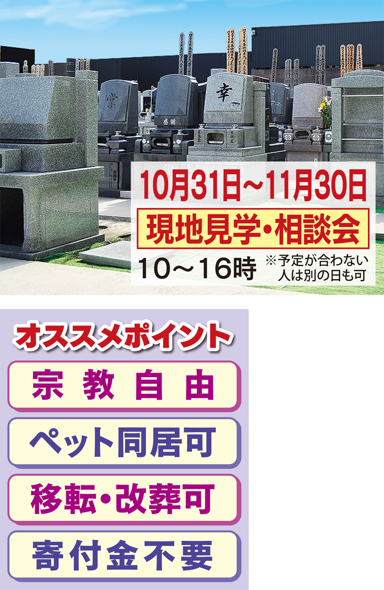 同霊園担当者によると、最近多い相談が「墓の引越し」「墓じまい」。先祖代々受け継がれてきた墓を引越すことに悩む人は多いというが、同霊園では、経験豊富なスタッフが親切、丁寧に相談にのってくれる。寺との交渉や手続きを全て代行してくれるため安心だ。「安心して相談できた」との声も寄せられている。