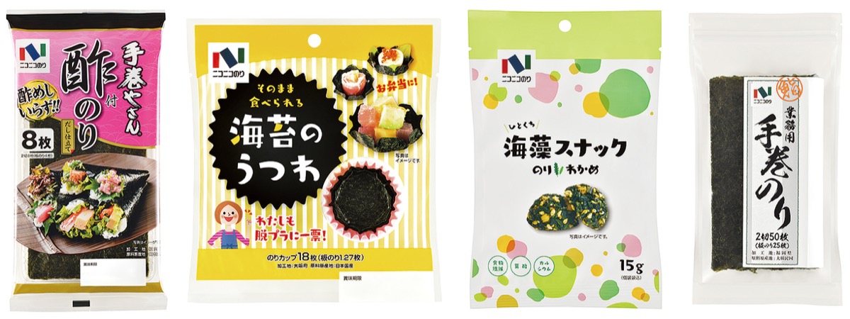ニコニコのり(株)では3月1日から春の新製品を発売する。酢飯要らずで手巻き寿司が作れる「手巻酢付のり2切8枚」のほか、焼きのりをカップにした「海苔のうつわ」、一口サイズで健康的なおやつとして楽しめる「海藻スナックのりわかめ」、お得な価格で大容量の「業務用手巻のり2切50枚」の4つ。