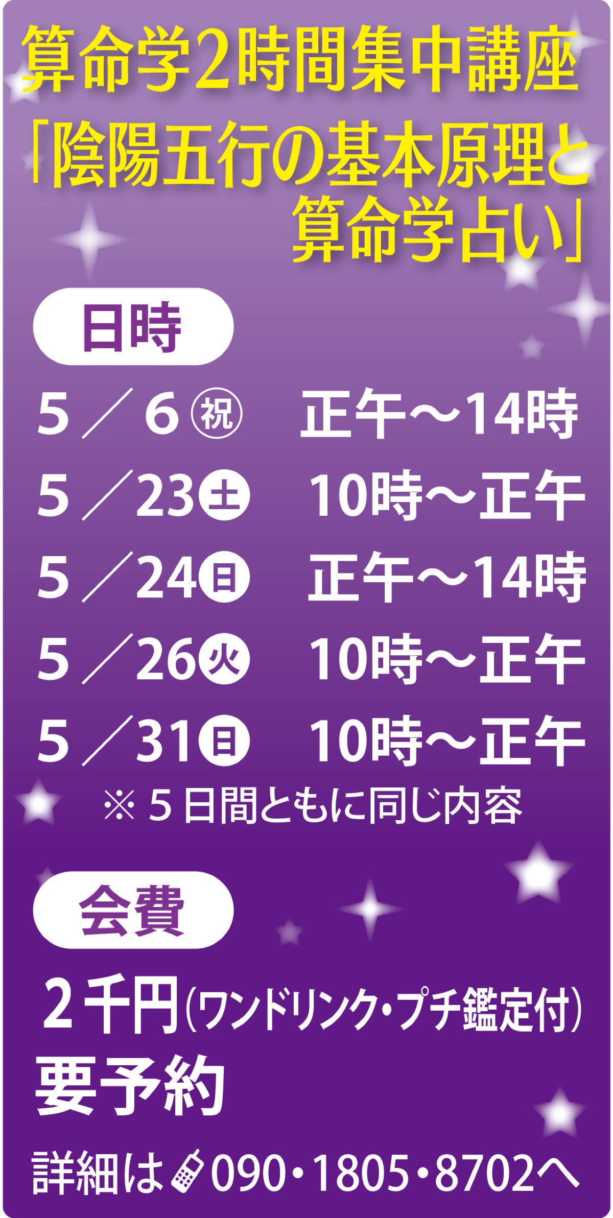 講師は、算命学教授の渋谷和憲さん。算命学は、中国に発祥した干支暦をもとに、生年月日からその人の持って生まれた宿命や運命を算出する予知学。講座では、基礎を学ぶほか命式表と天中殺時期などの鑑定を行ってくれる。会費は2千円(プチ鑑定・ワンドリンク付)。