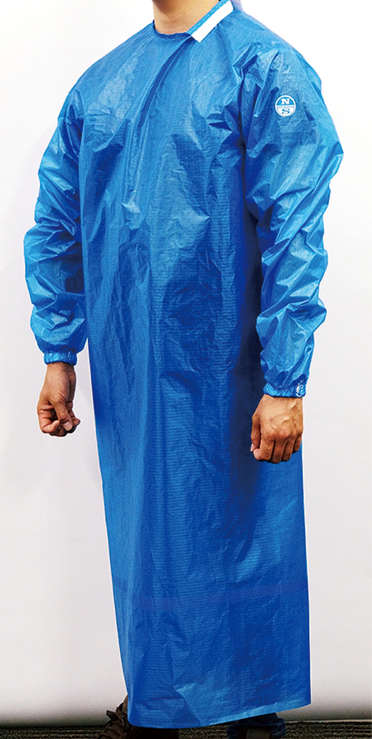 スピネーカーガウンは、使い捨てではなく洗浄し再利用することを想定している。セール生地で製作していることから、軽量で防水性、気密性に優れ、飛沫を防止する。首元、背部にベルクロを取り入れ、身長や体重を問わないワンサイズになっていることが特長だ。ただ、蒸れやすく、火気に弱く、新品は特に生地の特性上、静電気が帯電することがあり、使用の可否は各現場で判断してほしいとしている。