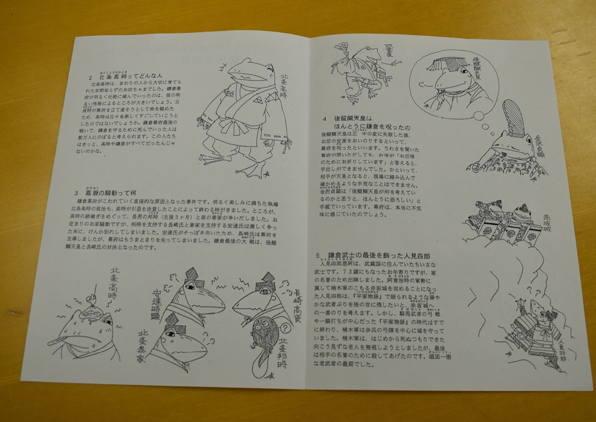 その補助解説冊子にカエルが登場するようになったのは、日韓サッカーW杯開催の前年、2001年。向坂さんが同僚と、「サッカーに関連ある展示を」という指示を受け企画を考えていた時のことだった。「鎌倉時代といえば、蹴鞠。例えば、鳥獣戯画のようにカエルを擬人化して蹴鞠が得意だった金沢北条氏をキャラクターにしてみたら面白いのでは」と思いついた。向坂さんが雑談をしながら、筆ペンでサラサラとカエルと化した北条氏を描くと、周りの同僚に大ウケ。それから、冊子に登場するようになり、施設のキャラクターとして定着していったという。