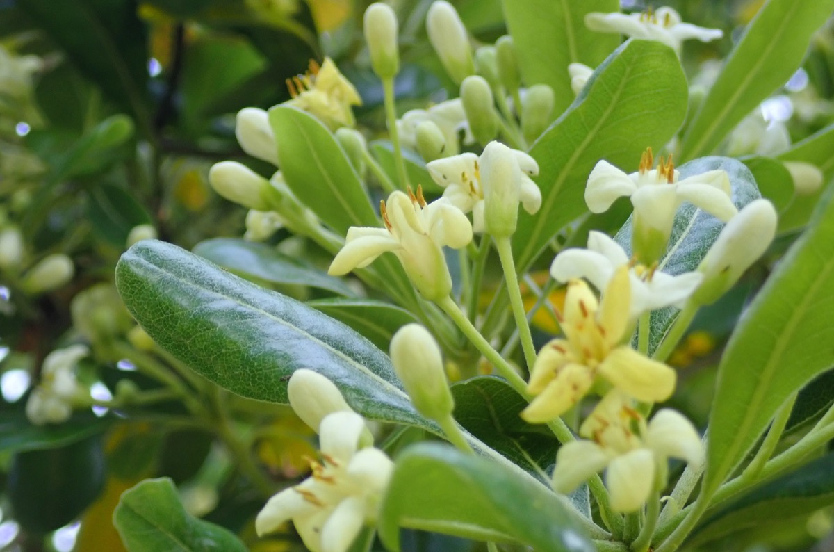 この時期、公園や道でトベラが甘い香りを漂わせています。トベラは、海岸沿いに育つ植物で、大気汚染や潮風につよく、植え込みとして広く使われています。大きく育つと2〜3メートルほどにも育ちます。また、花の香りと対照的に、枝葉を折ると強烈なチーズのような香りがします。そのことから英名はJapanese Cheesewoodともいうそうです。