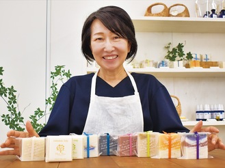 金沢区富岡東に手作り石けんの店舗兼工房「エレナフローラ」を開設して約3年。店主の堺谷美知さん(55)は、石けんの製造から販売、百貨店の出展、オンライン販売などをほぼ1人でこなす。合成の界面活性剤・保存料・着色料などの添加物を使わずに材料を厳選し、「コールドプロセス製法」で作り上げた石けんはまるで菓子のよう。店内には石けんに使ったアロマがふわりと香る。
