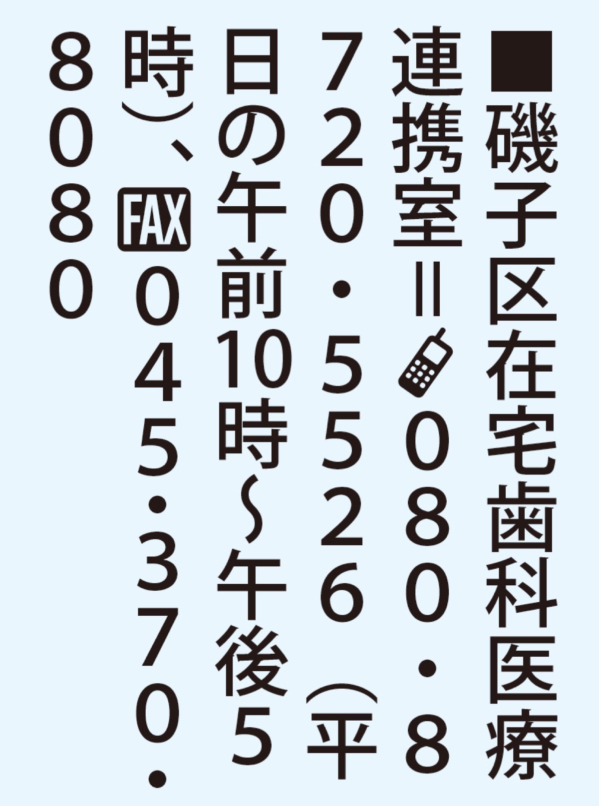 磯子歯科医師会は昨年度から、「訪問歯科診療なんでも相談室」を設置している。「通院が困難な方と歯科医院をつなぐお手伝いをいたします。健康と口腔ケアは密接に関わっているため、通院できない方こそ歯科医のサポートが必要です」と同会で地域連携を担当する歯科医師は話す。