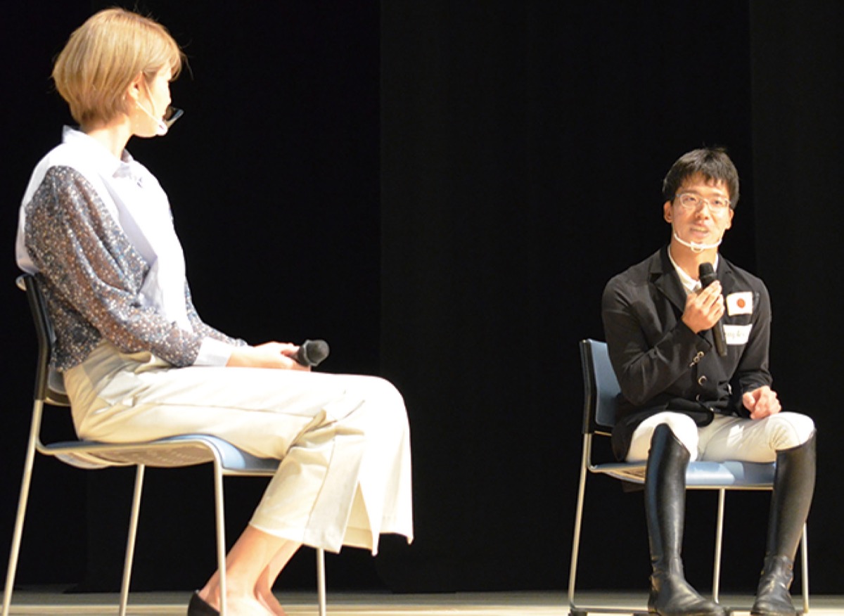 大学4年から本格的に競技を始めた稲葉選手は、日本ランキング1位で東京パラリンピックの有力候補。競技の相手が動物であることの難しさに触れながら「人馬一体となって結果を残せたときが本当に嬉しい」と魅力を来場者に伝えていた。また、脳性まひのため両足に障害がある稲葉さんは「同じ境遇の人たちに、頑張れば報われるという姿を見せ勇気づけたい」とし、「注目されるためには結果を出すことが大事」とパラ馬術初となるメダル獲得への決意を語った。
