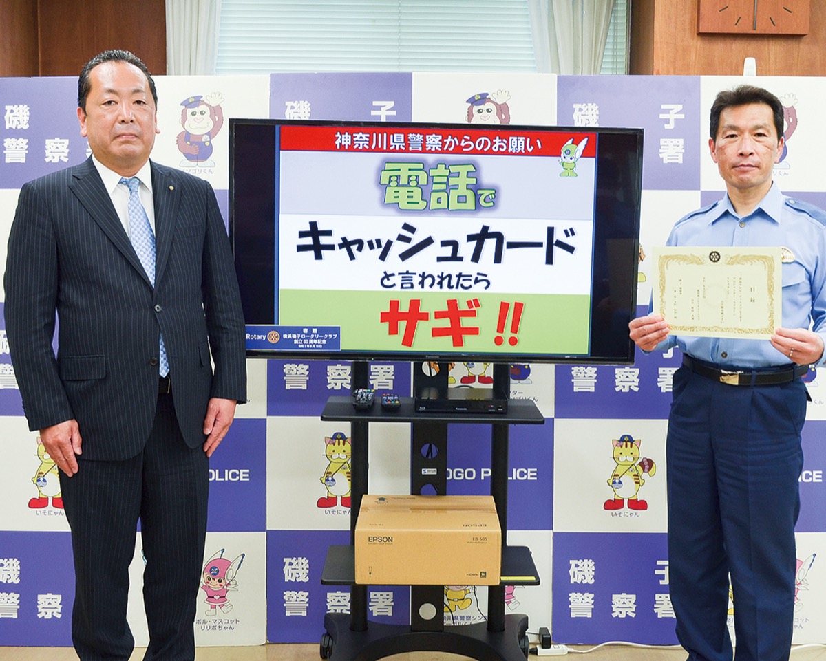 今回の寄贈は、磯子RC設立60周年の記念事業奉仕活動の一環として行われた。磯子区内では9月9日現在、特殊詐欺の認知件数が47件で、被害額は約7150万円にのぼる。区民に注意を呼びかけるために使用したいという磯子署からの要望があり、テレビ、プロジェクターなどが贈られた。磯子署では、1階窓口にディスプレイを置き、署を訪れた人に特殊詐欺被害防止を呼びかけていくという。