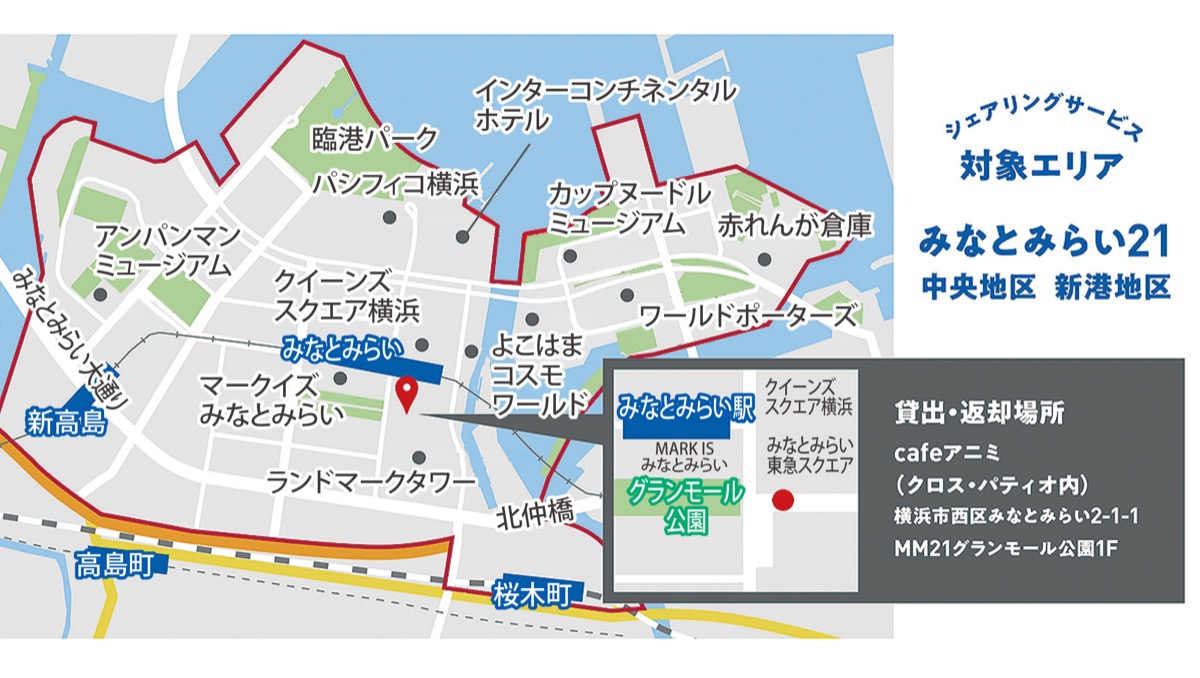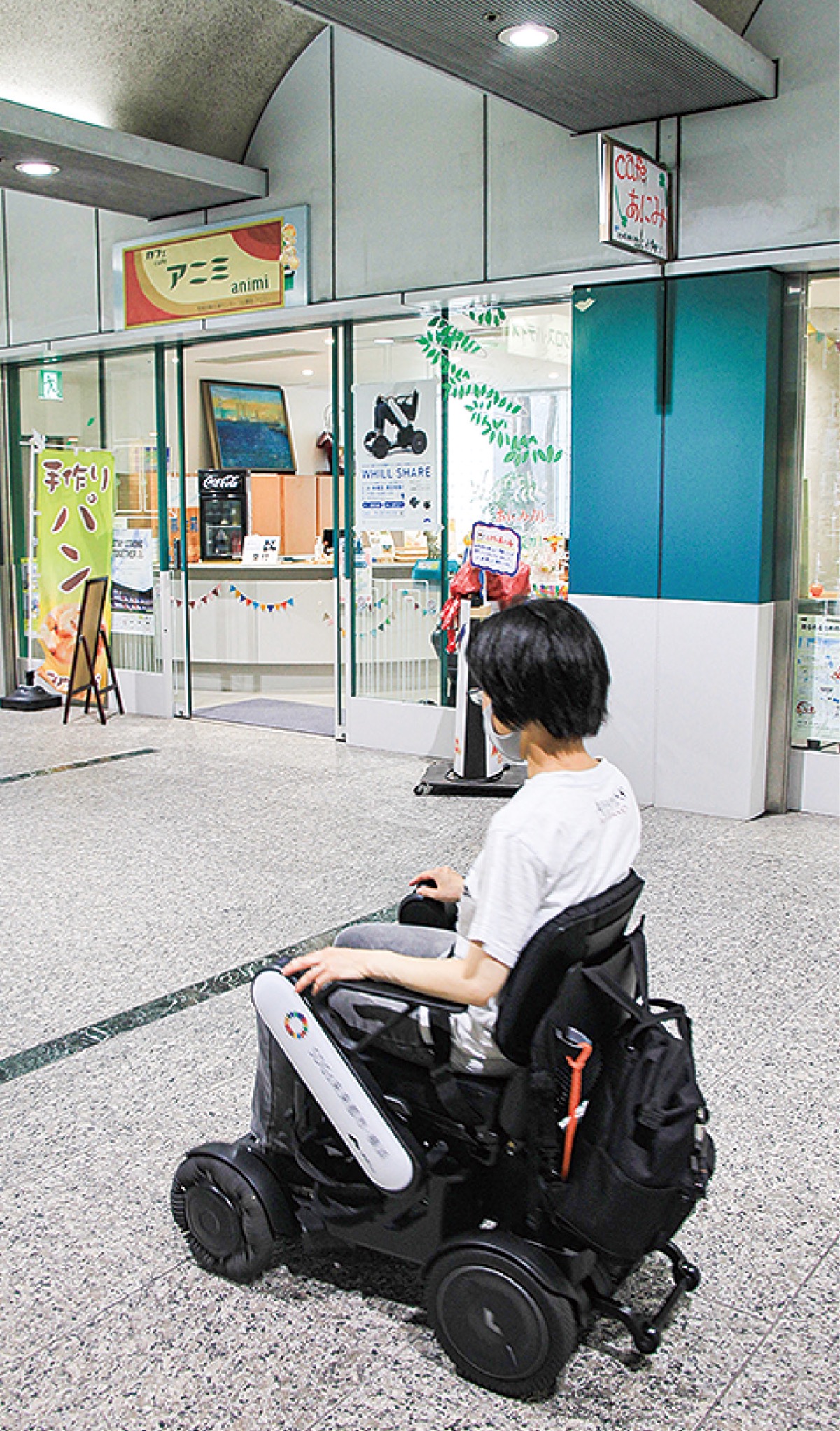 貸出、返却場所となるのは「cafeアニミ」=西区みなとみらい2の1の1 クロスパティオ内。同店を経営するNPO法人アニミの服部一弘理事長は20代の頃に交通事故で車イス生活になった。今回の話を受け、運営拠点となることを快諾。服部理事長は「パーソナルモビリティが広まれば車イスが日常にあることが普通になるはず」と期待を込める。