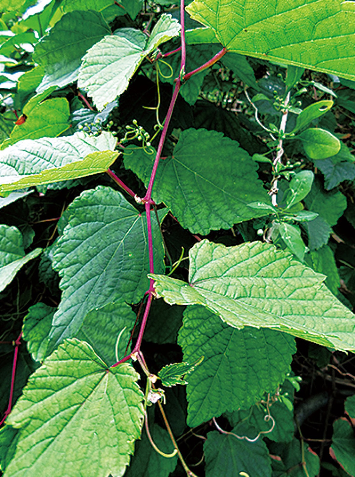 ノブドウの巻きひげは葉と対生して伸びており、他物に巻き付き体を支えながら成長していきます。この巻きひげは各節(互生の葉が出ている部分)毎に着いており、ひげの先端は2つに分かれています。エビヅル巻きひげは2節つるが出て、1節休む(巻きひげが出ない)を繰り返して伸びていきます。