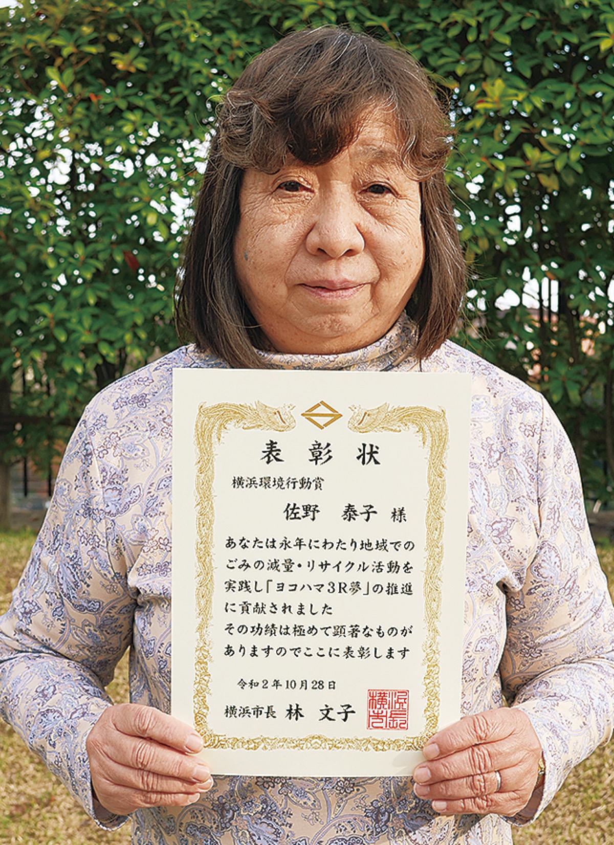 横浜市は10月28日、2020年度横浜環境行動賞「ヨコハマ3R夢」推進者表彰の受賞者を発表した。ヨコハマ3R夢行動推進者(個人の部)には磯子区氷取沢町在住の佐野泰子さん(67)=写真=ら3人が選ばれた。これは、地域でのリサイクル活動や分別指導、啓発活動など「ヨコハマ3R夢」の推進に功労のあった個人や団体を表彰するもの。