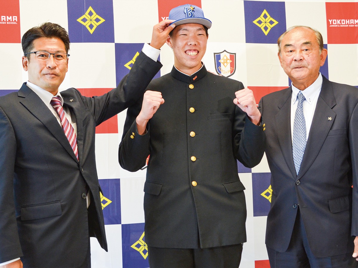 プロ野球ドラフト会議で横浜DeNAベイスターズから3位で指名された横浜高校(金沢区能見台通)の松本隆之介投手が11月4日、同校で吉田孝司顧問兼球団代表補佐ら球団関係者から指名あいさつを受けた。